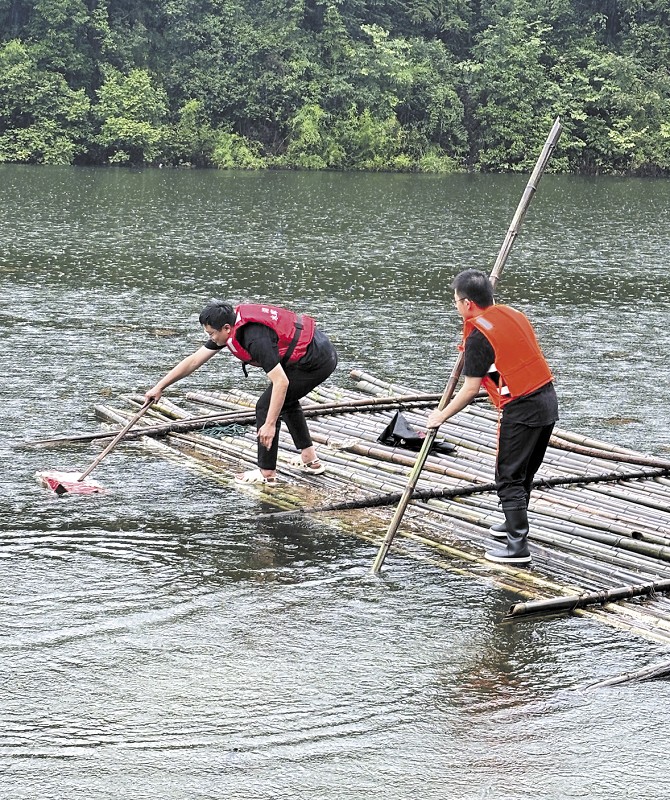 7月1日,桃江县武潭镇青叶洞水库守库员架着竹筏,清理河面上的水草与垃圾。胡蕾摄