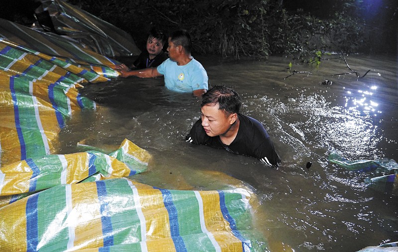 7月3日晚上,资阳区沙头镇永明村,防汛队员跳入水中压彩条布,防止下面的沙袋被水冲走。黄云摄