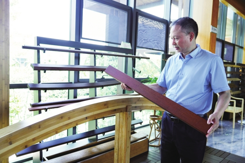 放眼全市装配式建筑产业领域,桃江县依托自身产业基础,形成各具特色的产业集群。在湖南桃花江竹材科技股份有限公司,创始人薛志成正推动产品向C端拓展,市场将迈向海外50个国家和地区:“竹子生长速度快、培育周期短,越砍越有,是用作建筑原材料的不二选择。”以竹材为原料生产的户外防腐、防霉、防晒产品性能稳定、环保健康。20年来,公司坚持创新发展,是国内竹子装配式建筑行业的开拓者。公司研发出的以竹材为原材料的产品有16000多种,涵盖户外防腐、装饰、装配式建筑结构件、家具等方面,形成了益阳独有的“绿色积木”。