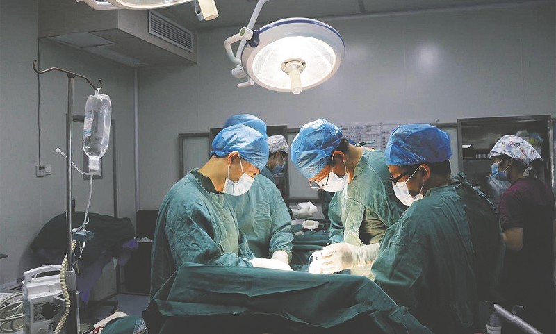 北京大学第一医院张澜波教授(右二)在大通湖为患者做手术。