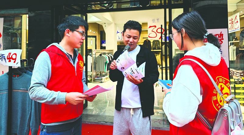 志愿者向商户宣讲消防安全知识并发放宣传单。 (图片由资阳区汽车路街道办提供)