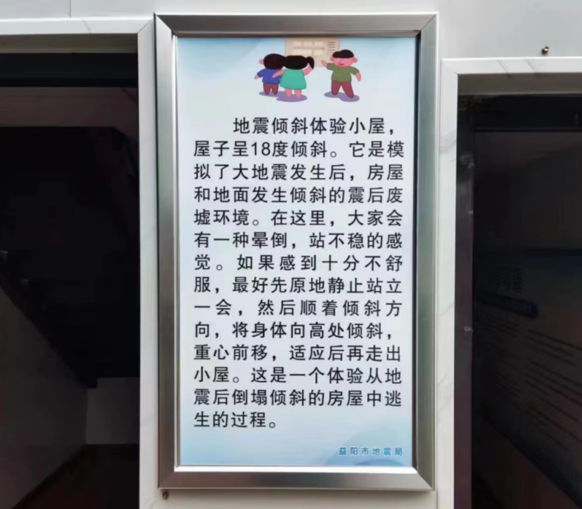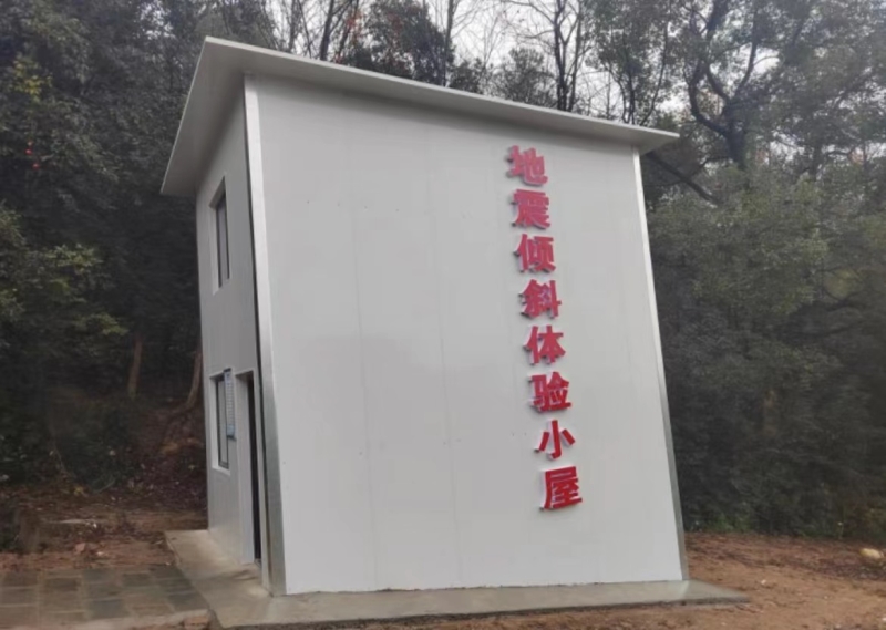 小屋模拟建筑结构被地震损坏的情形,整体歪斜,室内地面与水平面呈18度倾斜。参观者进入小屋时,马上会感觉整个人都斜了过来,行走困难,努力想保持平衡,身体却不听使唤。专家介绍,参观者进入小屋后,踩在倾斜的地板上,而视觉给予的信息是房内地面处于水平状态,由于视错觉和人体感受所产生的矛盾,马上会体验到震后在废墟环境中逃生产生的失稳感、眩晕感等特殊感受。据了解,当地还规划以地震倾斜体验小屋为中心,打造科普长廊,通过互动体验和科普宣传,让来往游客、附近村民了解学习防灾减灾知识和应急避难技巧,学会用科学的方法和手段应对自然灾害。