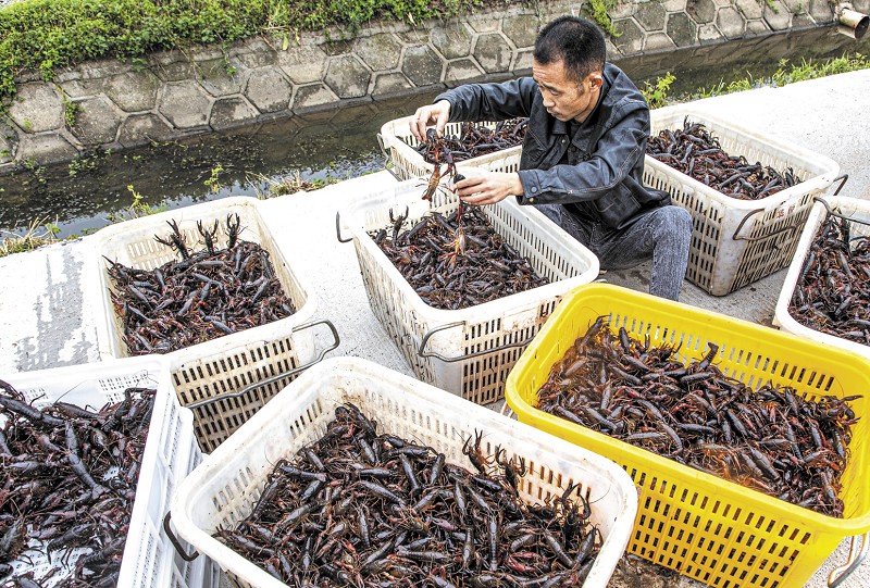 小龙虾上市时节,虾农将捕捞上来的小龙虾装筐过秤。刘馨予摄