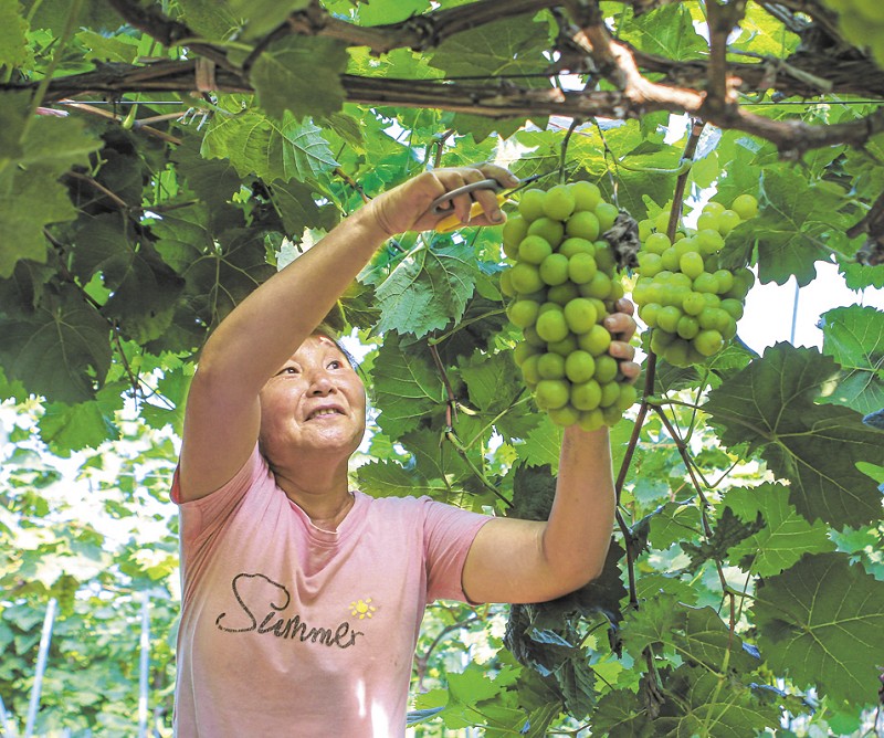 葡萄架下,果农们采摘运输成熟的阳光玫瑰,脸上洋溢着丰收的喜悦。肖乐峰摄