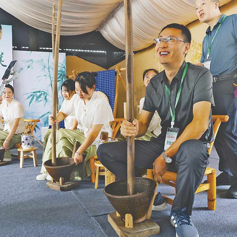 ▲嘉宾在三堂街水岸湿地度假庄园体验擂茶。 吴巧摄