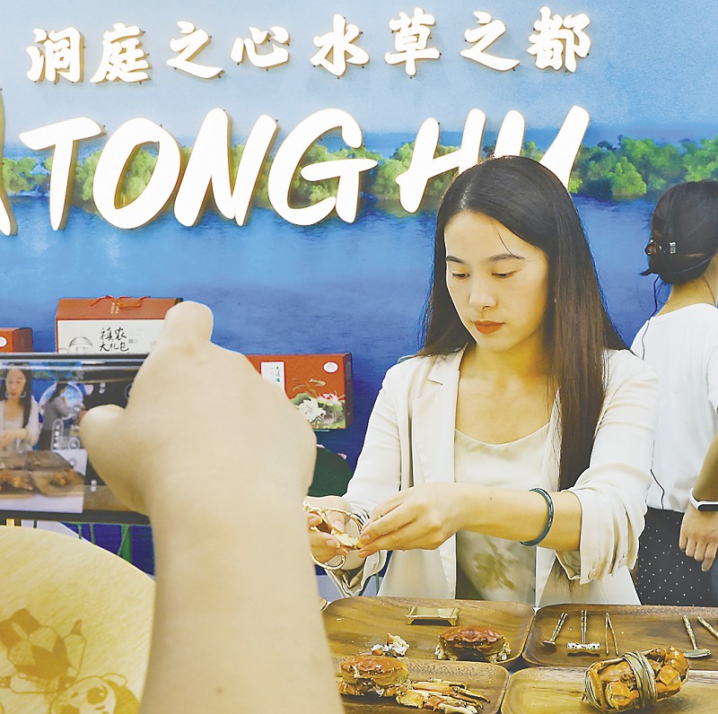 ▲ 益阳市文旅产业发展成果集中展示展览活动在桃花江竹海景区“竹海集市”举行,大通湖展区工作人员向嘉宾展示当地特产。吴巧摄
