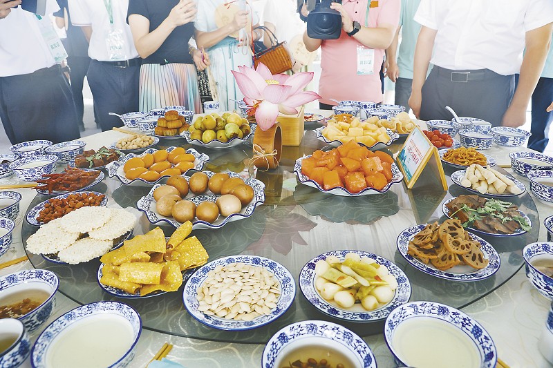 三堂街水岸湿地度假庄园工作人员向嘉宾介绍桃江特色民俗“五道茶二十四碟”。吴巧摄