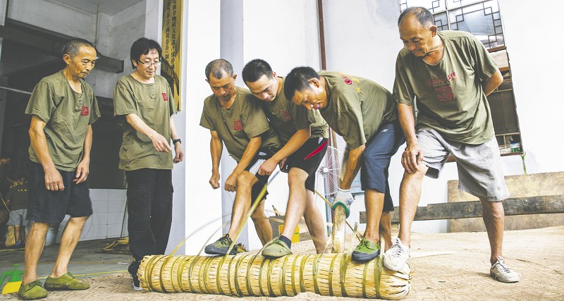 国家级非物质文化遗产千两茶制作技艺代表性传承人李胜夫(左二)在指导千两茶踩制。王劲伟摄