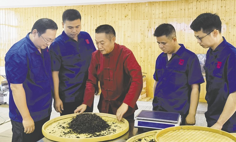 中国制茶大师、湖南白沙溪茶厂股份有限公司首席专家肖益平(中)在“安化天尖茶白沙溪工坊”传授天尖茶制作工艺。受访者供图