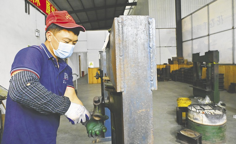 安化黑砖茶在高温汽蒸灭菌后高压定型。吴胜琳摄