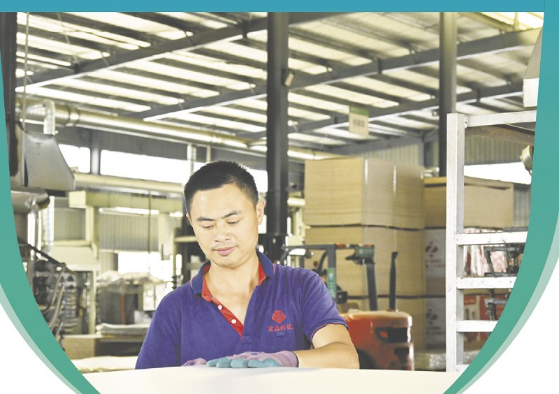 桃江县宏森木业生产车间里,工人正在压板。吴胜琳摄