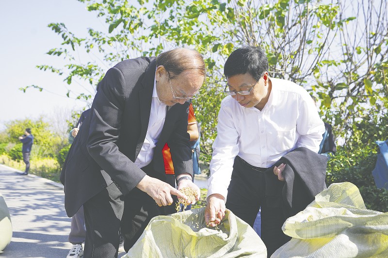 ▲ 湖南农业大学唐启源教授(右)和中国工程院院士、华南农业大学教授罗锡文(左)一起在田间见证再生稻测产。 胡紫鑫摄