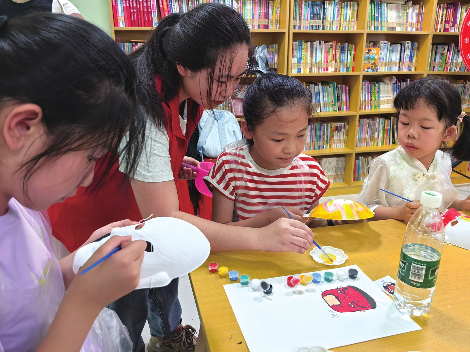 一名大学生志愿者认真教孩子们在脸谱模型上填色。曹灿摄