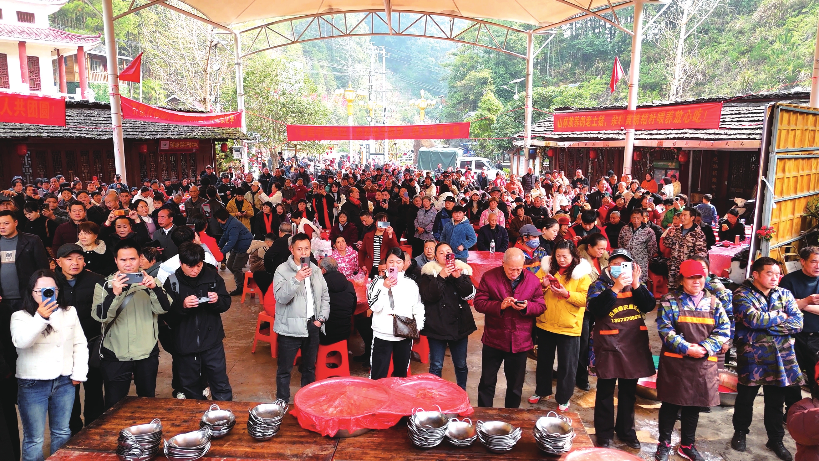 夏北星望着通往万福山景区的路。昨天这里车水马龙,停满了私家车和大巴,后来车辆实在停不下,只能停到村部再坐接驳车过来,热闹非凡。“杀了18头跑山猪,现场还卖出去1000公斤鲜肉。”他说这话时,眼里闪着光,那些喝山泉水、吃黄精秸秆长大的跑山猪,成就了宴席最地道的风味。更让他欣慰的,是游客们离开时的念叨:有人说要开春再来爬万福山,看晴日里的绿林溪流;有人问大安传统村落的老茶园还能不能采茶,想在晴日里摘几片新叶;还有人留了联系方式,说以后要订购跑山猪。“本来只是想让乡亲们聚聚。”夏北星笑着说,“没想到把咱渠江的好山好水、好味道都推出去了。”