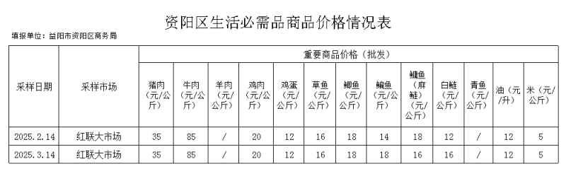 资阳区2025年3月14日生活必需品价格情况表