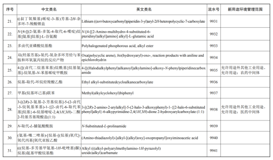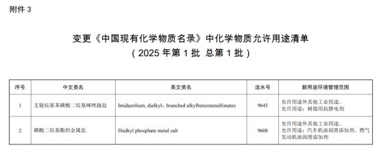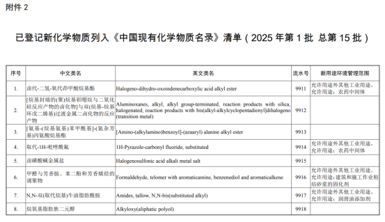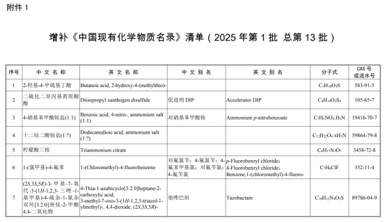 根据《新化学物质环境管理登记办法》(生态环境部令第12号)及其配套文件的相关规定,发布增补《中国现有化学物质名录》清单(2025年第1批,总第13批)、已登记新化学物质列入《中国现有化学物质名录》清单(2025年第1批,总第15批)、变更《中国现有化学物质名录》中化学物质允许用途清单(2025年第1批,总第1批)。