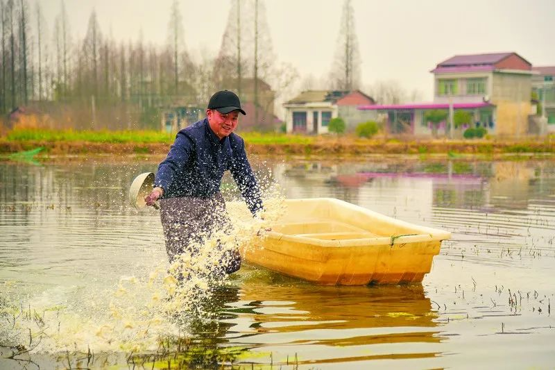 徐忠良站在及膝高的水中,用力将生石灰水洒入稻虾田中。“生石灰不仅可以消毒、杀菌,还可以增加水体钙含量,对小龙虾的生长蜕壳都有帮助。”徐忠良告诉记者,这片稻虾田有20余亩,“春养虾秋种稻”的种植模式让田里一年到头都有收入。