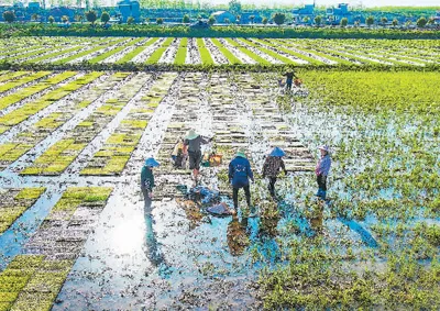4月17日,南县武圣宫镇百联村千亩育秧基地内,一片繁忙。基地负责人符安祥正带着村民们将育秧大棚内码好的秧盘往田里运。