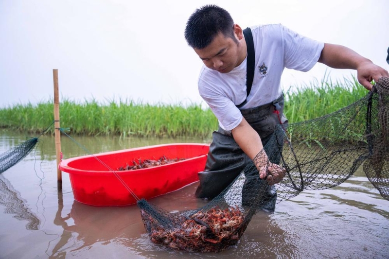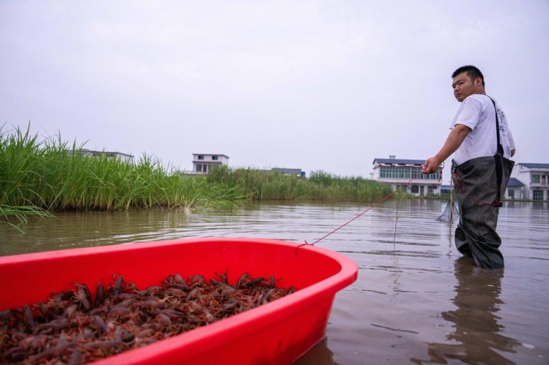 5月19日清晨,虾农在南县南洲镇南山村稻虾种养基地捕捞小龙虾。