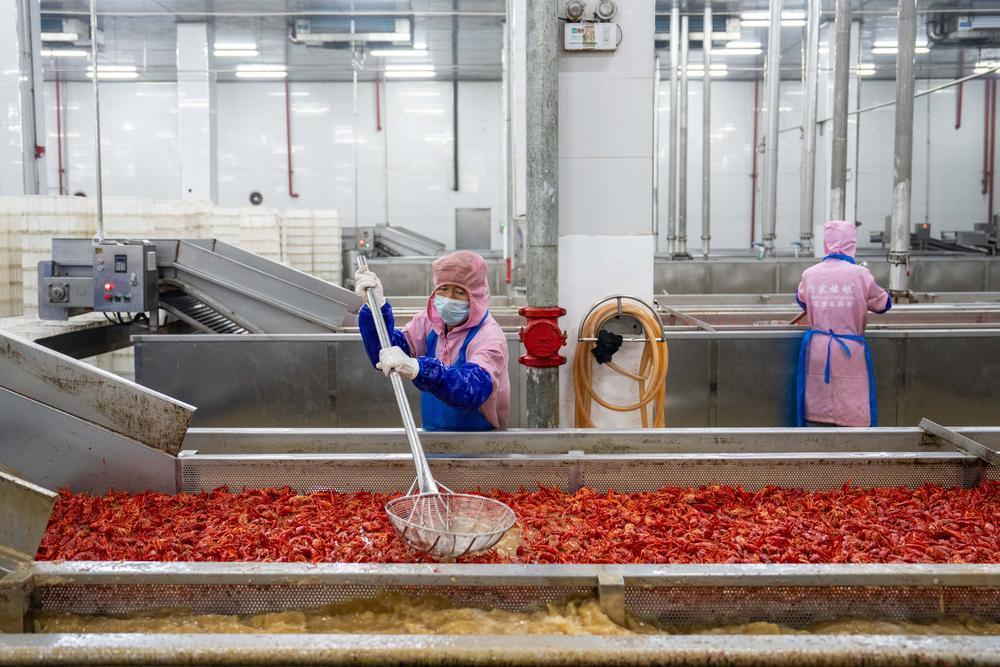 5月19日,工人在南县顺祥食品有限公司小龙虾加工车间卤制小龙虾。
