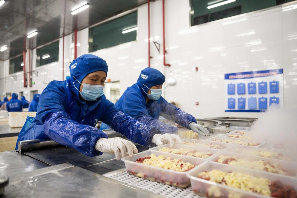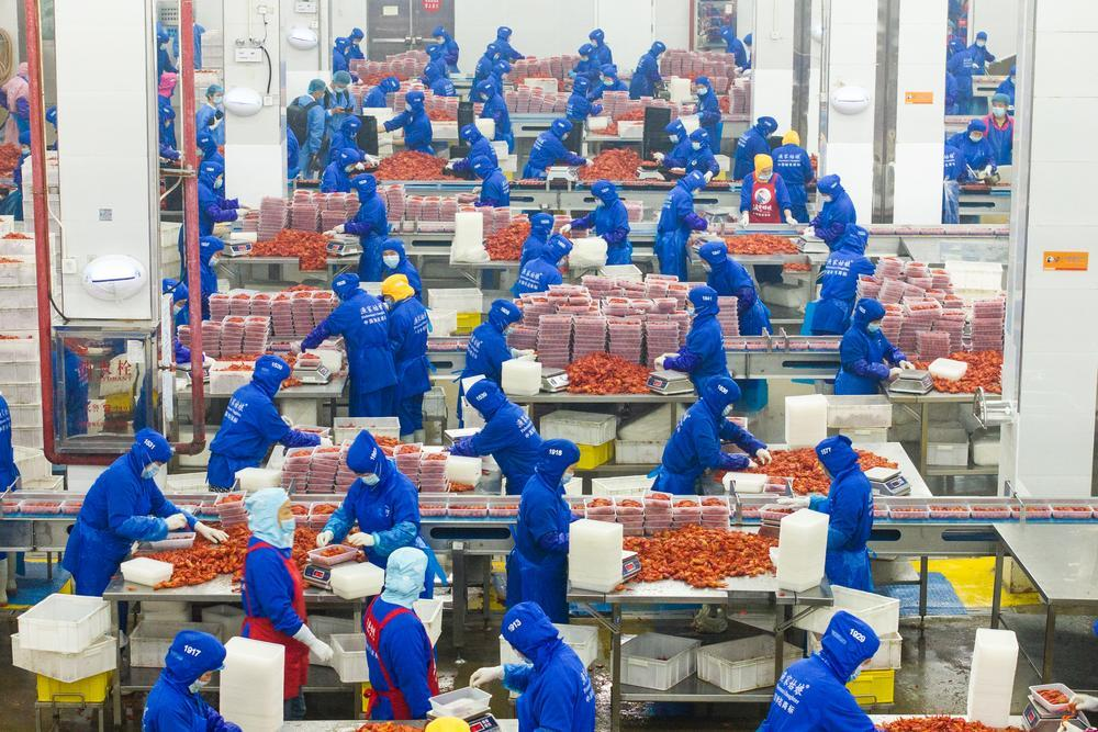 5月19日,工人在南县顺祥食品有限公司小龙虾加工车间进行摆盘。