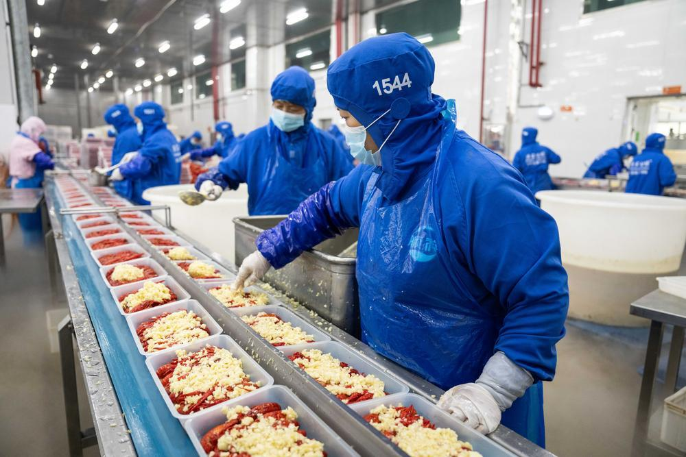 5月19日,工人在南县顺祥食品有限公司小龙虾加工车间给预制小龙虾添加佐料。
