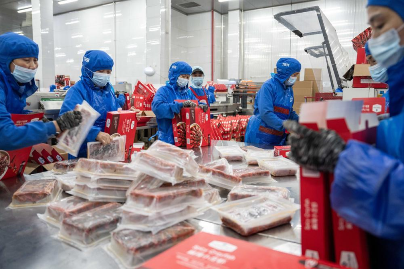 5月19日,南县顺祥食品有限公司工人在车间包装预制好的小龙虾。