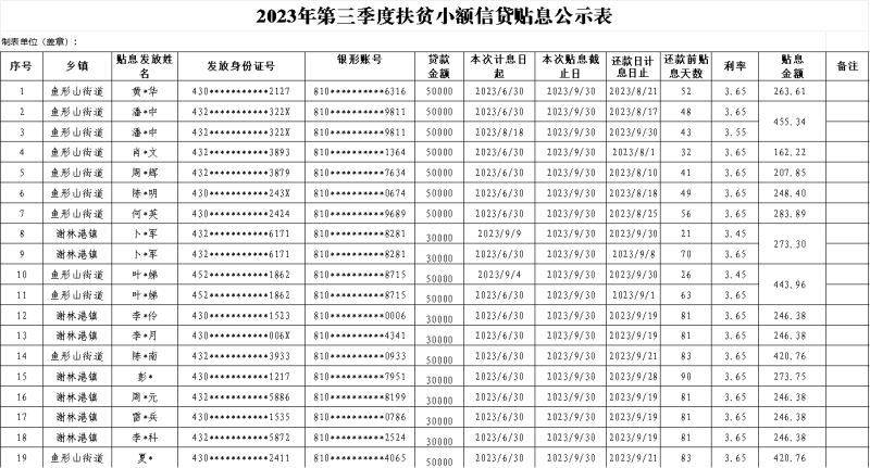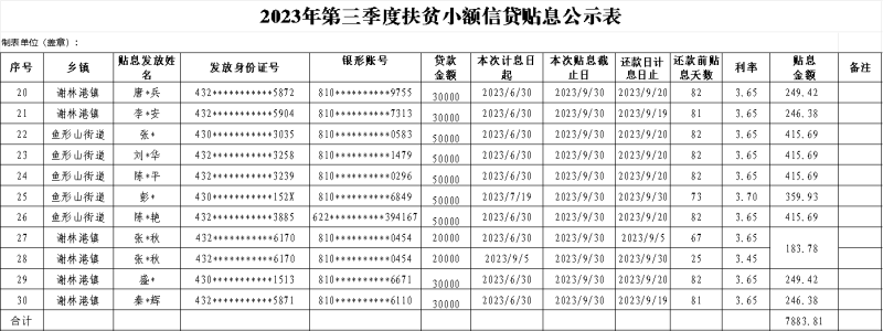 附:2023年第三季度扶贫小额信贷贴息公示表