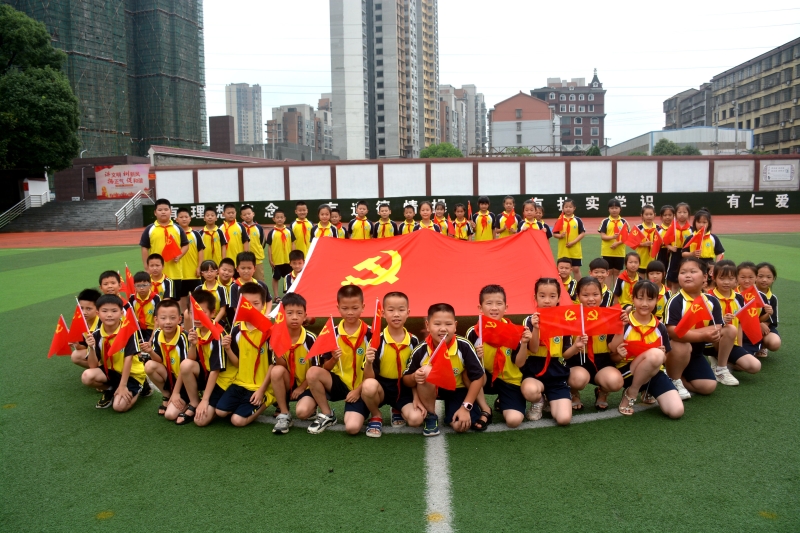 落实五育并举,推进党史学习教育进校园。图为三益小学的学生与党旗合影