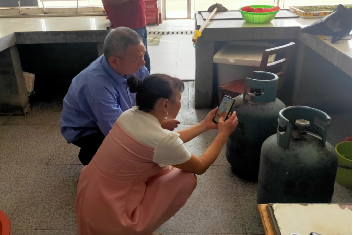 (执法检查人员指导李女士用手机扫描液化气钢瓶上的二维码)