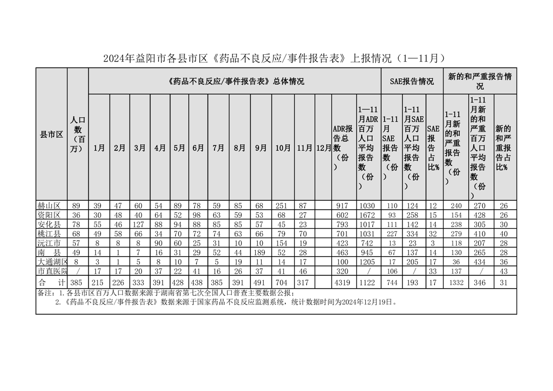 | 2024年益阳市各区县《药品不良反应事件报告表》上报情况(1—11月) |